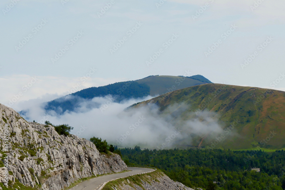 Fog covering mountain landscape in French Pyrenees, France. Clouds floating over the tops of the hills. Conceptual for climate change