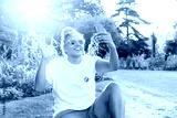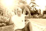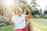 Happy Laughing lesbian lgbtq woman using mobile phone at park, having video chat with friends, doing online shopping, checking social media, creating content for followers. Celebrating Pride month