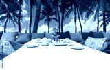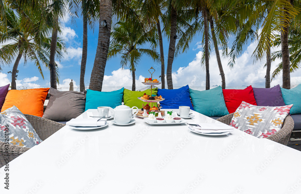 Afternoon tea and sweets on the table English afternoon tea in cafe by the sea: scones with cream and strawberry jam with various sandwiches on selective focus background.