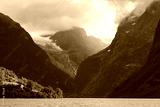 Landscape of the Lovatnet glacial lake with turquoise crystal clear water, Norway