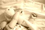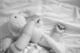 Cute Caucasian baby sleeps with a plush bunny on white sheets