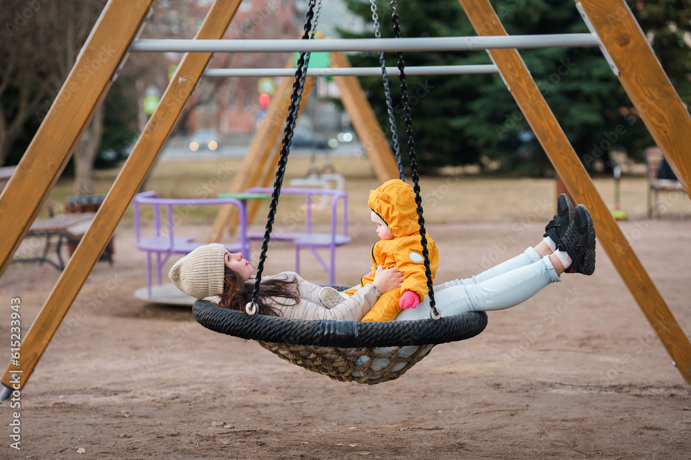 Baby toddler with his mom in a winter jumpsuit swinging on a wicker swing on the playground