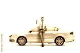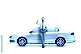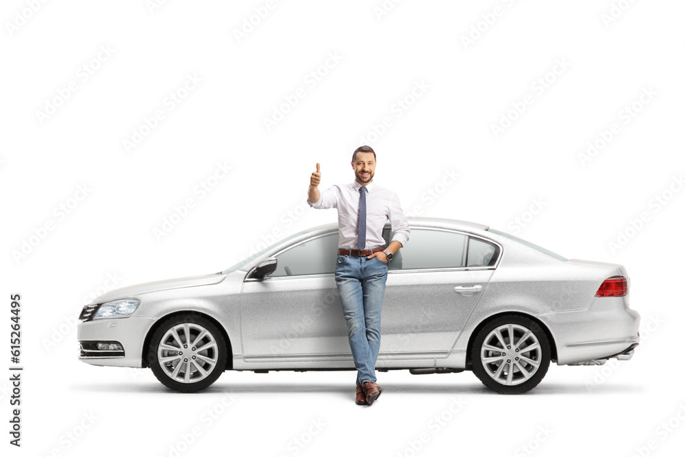 Full length portrait of a man leaning on a silver car and gesturing thumbs up