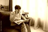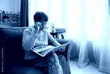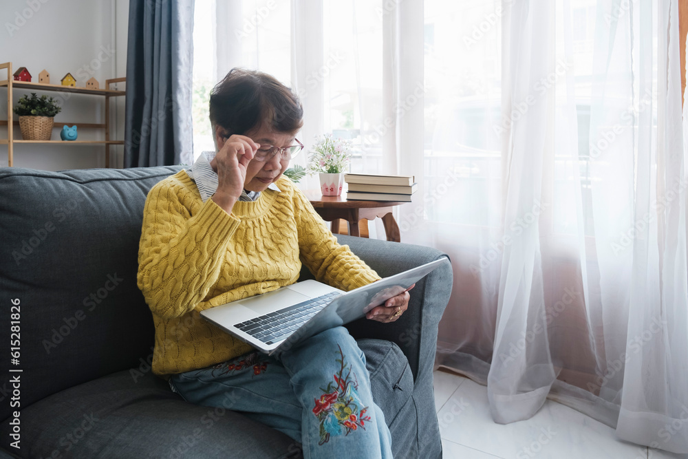 The senior Asian woman sitting on sofa and using notebook labtop computer in living room with happy face.