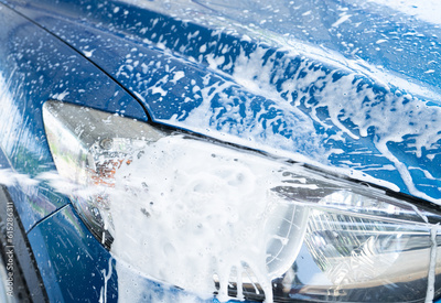 Blue car wash with white soap foam. Auto care business. Car cleaning service. Vehicle cleaning service. Foam wash car detailing. Headlamp light of the blue luxury SUV car is covered with white foam.