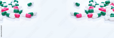 Capsules pill spread on white background. Prescription drugs. Capsule pill frame banner. Green, pink, and white color capsule pills. Pharmaceutical industry. Medication and pharmacology. Health care.