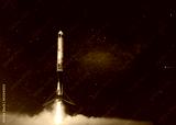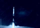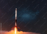 New Ship Rocket flies with blast to another planet. Spaceship takes off into the starry sky. Rocket starts into space. Concept. Creative travel idea