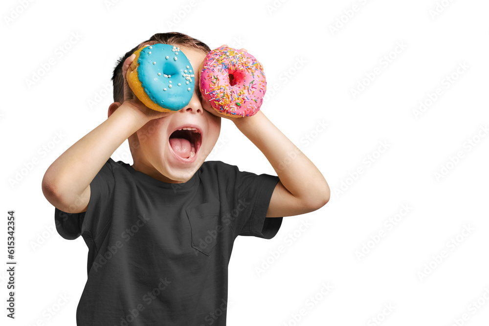 Happy cute boy is having fun played with donuts on png background. Bright photo of a child.