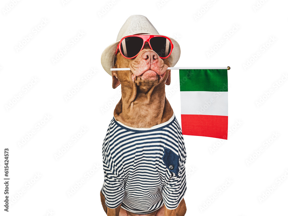 Cute dog and Italian Flag. Closeup, indoors. Studio photo. Congratulations for family, loved ones, relatives, friends and colleagues. Pets care concept