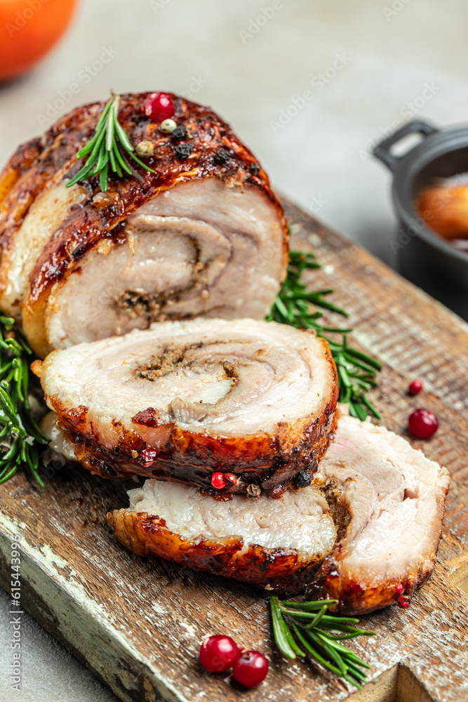 Roll of meat with various spices and berry sauce, vertical image. top view. place for text