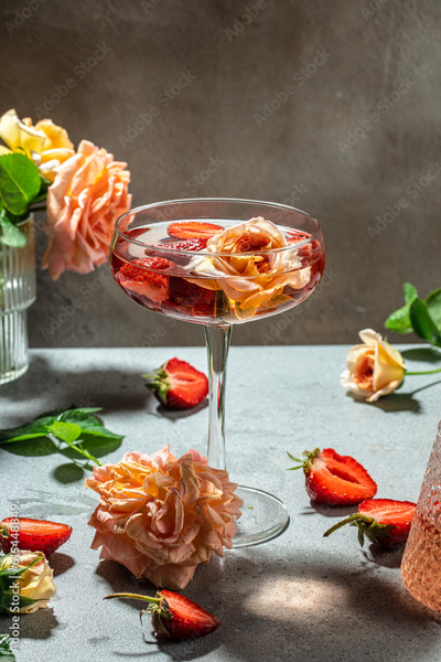 alcoholic cocktail with wine, strawberry in glasses, vertical image. top view. place for text