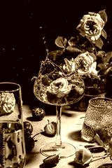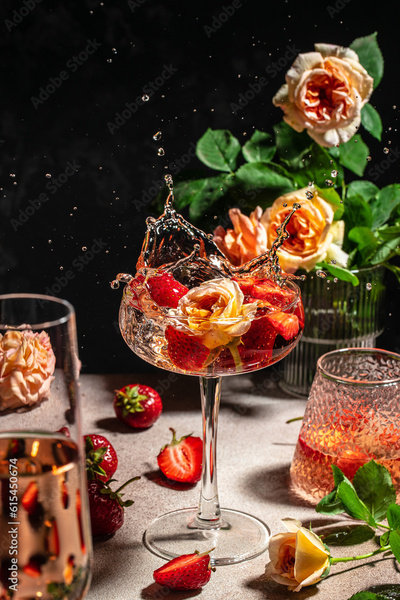 Summer wine with strawberries and roses. Freeze motion splash drops of rose wine