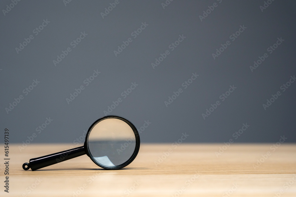 Magnifying glass on a grey background. Search and analysis, analytics and study. Pay attention to details and problems. Find something. Journalistic investigations and research. Search tool