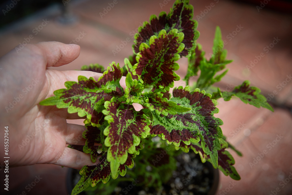 Coleus Blumei Plectranthus scutellarioides. Name of the plant variety Solar flair. Coleus leaves in hand close-up.