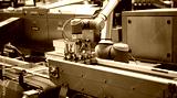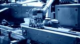 Automated robot arm lifting food can to conveyor belt in food industry.