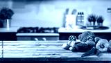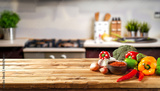 Empty wooden table with fresh vegetables and spices and cook on the background blurred kitchen, space for you to edit the product