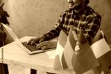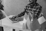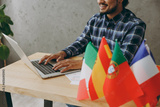 Cropped close up translator young employee business Indian man he wear casual blue checkered shirt typing on keyboard near many different flags sit work at office desk with laptop pc computer indoors