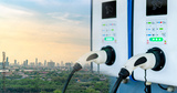 Electric vehicle charging station and sustainable city. EV charging infrastructure. Eco-friendly city. Green city transportation. Clean energy. Low carbon city. ESG sustainability. CO2 reduction.