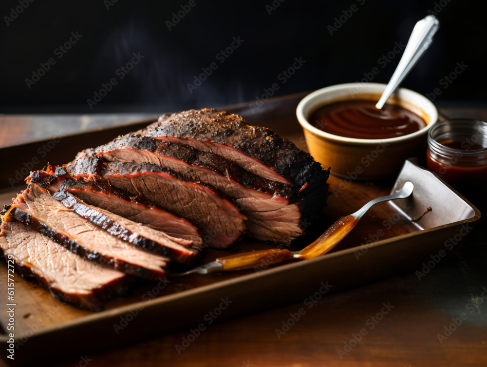 A tray of smoky and tender beef brisket, slow-cooked to perfection and served with barbecue sauce.