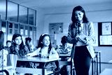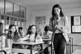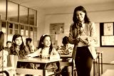 Happy Hispanic gives exam paper to her students during class at elementary school.