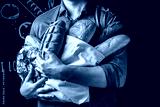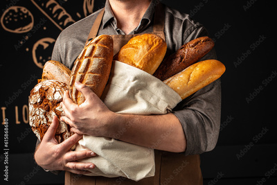 Man holding breas in his hands. Different types of bread. bakery products on a dark background. Long banner format