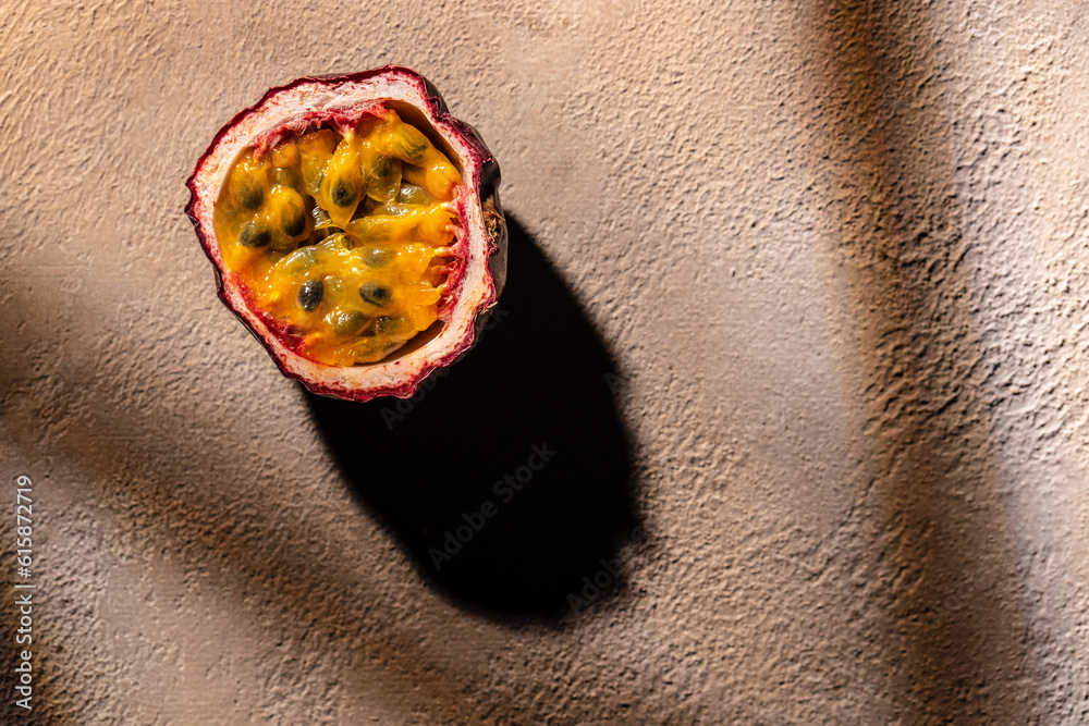Passion fruits on dark background. Set of whole and half of fresh passion fruit. place for text, top view
