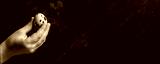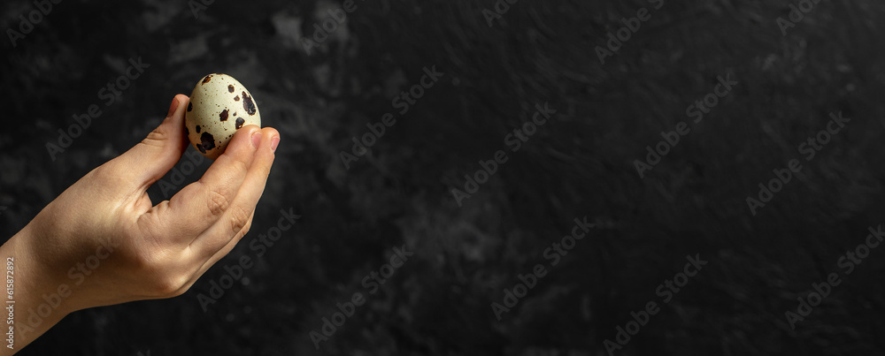 man holding chicken and quail egg in hand on a dark background, banner, menu, recipe place for text
