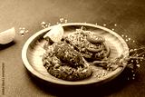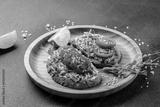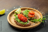 Fresh green Avocado sandwich on dark rye bread made with fresh sliced tomatoes and lime. place for text, top view