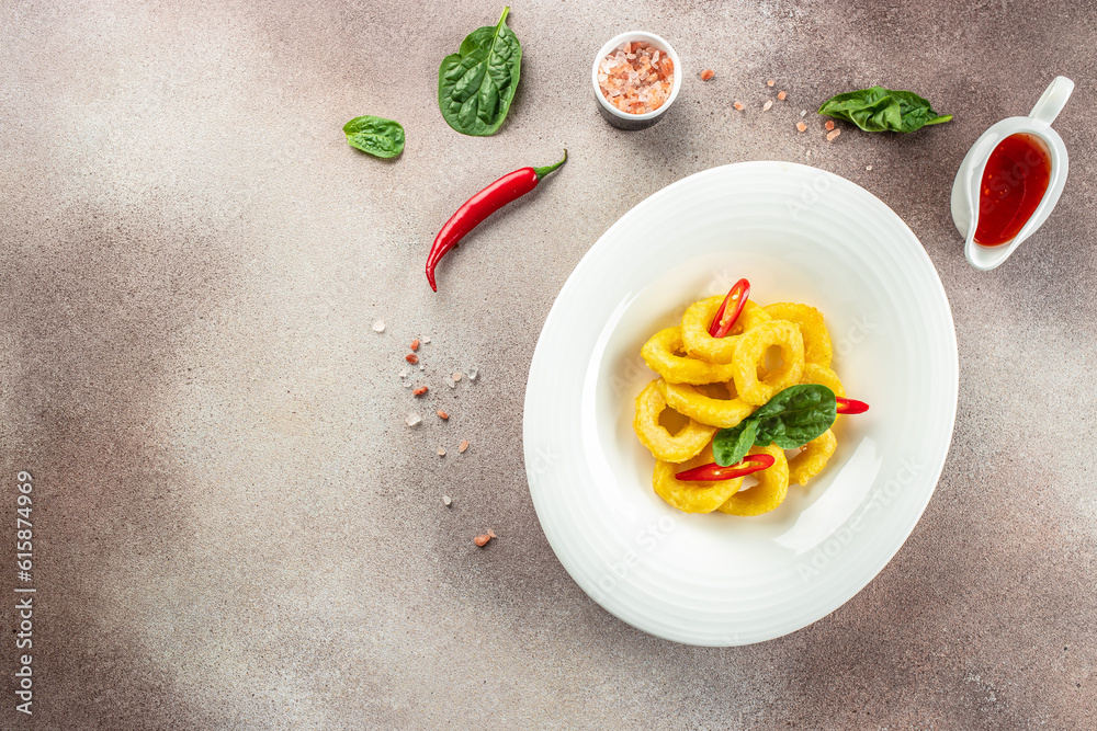 fried squid rings breaded on a dark background. banner, menu, recipe place for text, top view