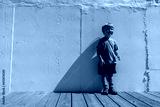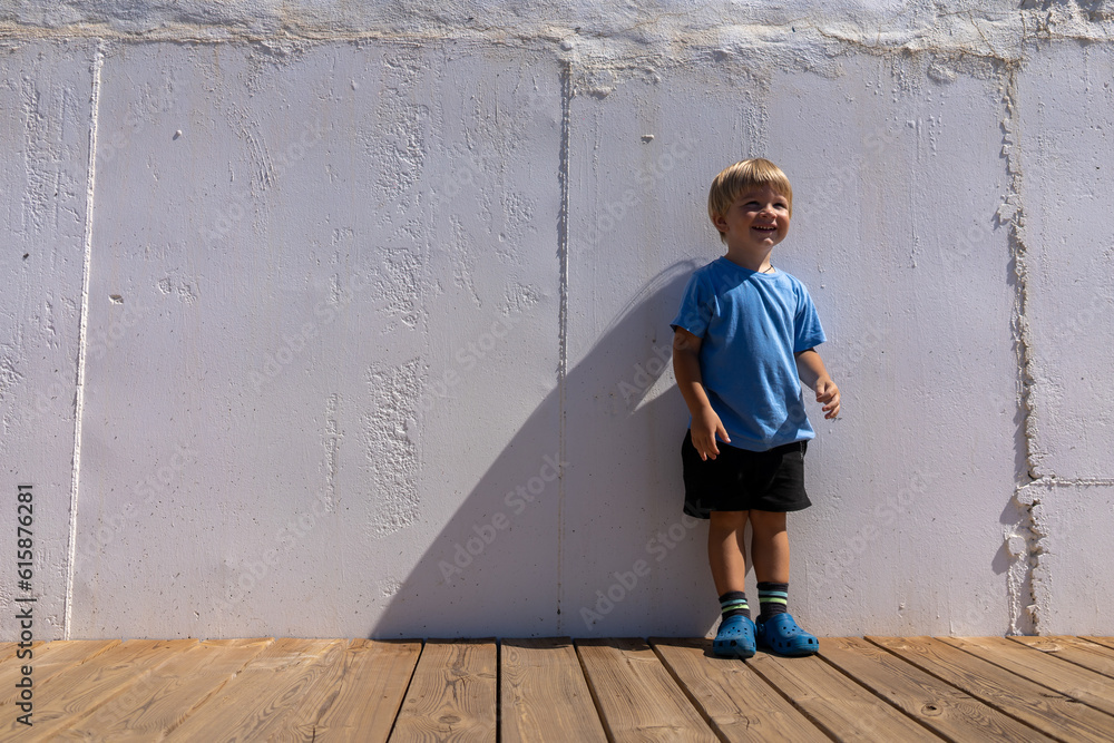 boy 3 years old blond blue t-shirt black shorts stands against the background of a white wall Fashion photography