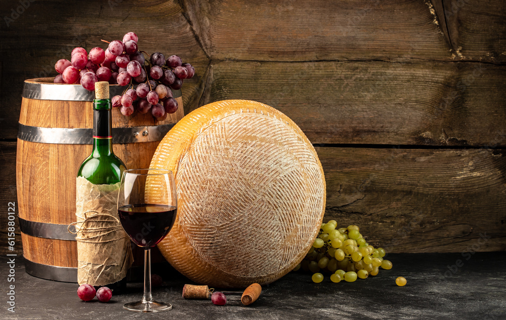 Glass of red wine, cheeses and grapes on a wooden background, A head of hard cheese, Long banner format