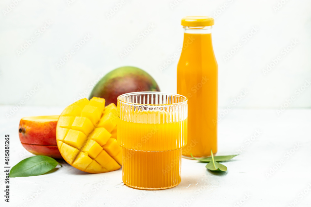 mango juice. Fresh tropical fruit smoothie on a white background. Long banner format