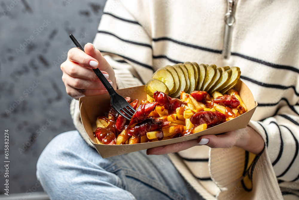 Female hands holding box French fries baked with cheddar cheese, pickle and sausages, Fast food take away. Top view, copy space