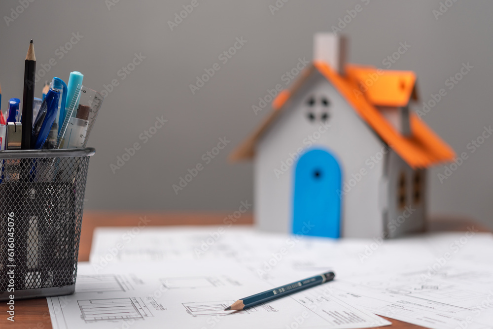 Architectural blueprints document and house model marked by measurements and construction and design details.