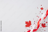 Victoria Day festivities concept in Canada. Top view flat lay of red maple leaves, stars confetti, satin ribbons on white background with empty space for text or greeting