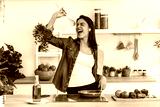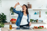 Beautiful young woman cooking while singing and listening music with earphones in the kitchen at home.