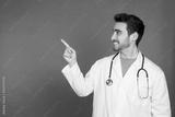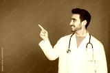 Smiling doctor pointing to copy space in studio