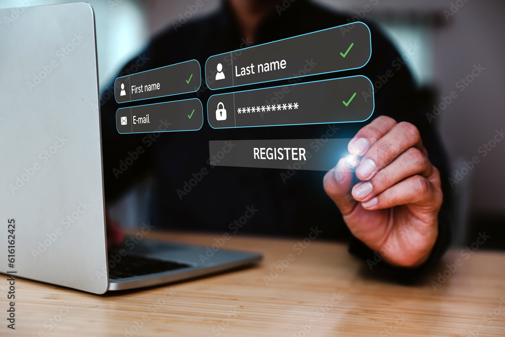 Businessman use laptop login username and password identity or sign up register concepts of cyber security, internet access, join social or personal data protection or forget pass key unlock.