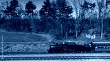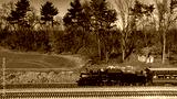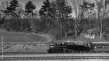 A Drone View of a Restored Steam Passenger Train Traveling Thru Farmlands Pulling Up to a Small Station on an Autumn Day