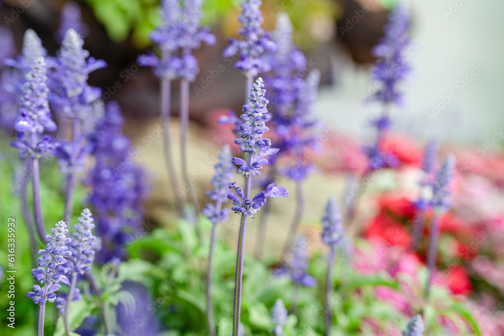 Beautiful purple Blue Salvia flowers blooming in the daytime against a field background.