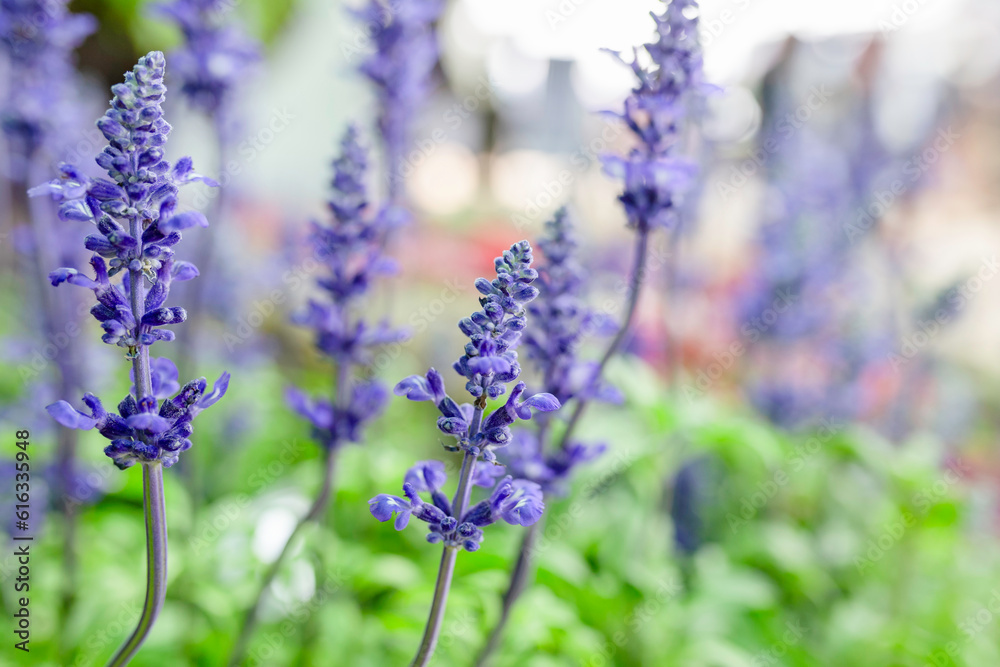 Beautiful purple Blue Salvia flowers blooming in the daytime against a field background.