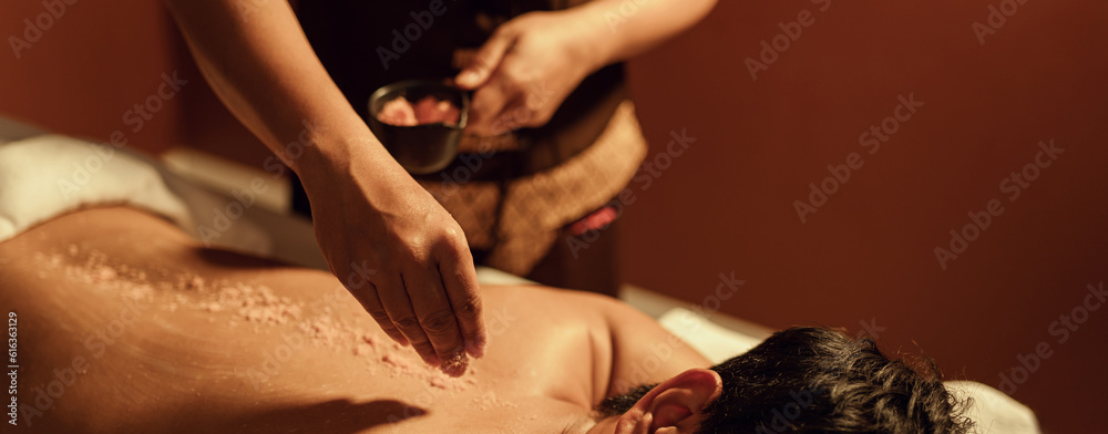 Masseuse hands pouring salt scrub on back customer at health spa. Relaxation man customer get service skincare scrubbing massage with masseuse in spa salon. Selective focus.