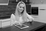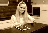 Young woman using a tablet pc in the kitchen with coffee