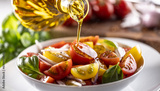 Olive oil is pouring on fresh tomato salad mixed with red onion
