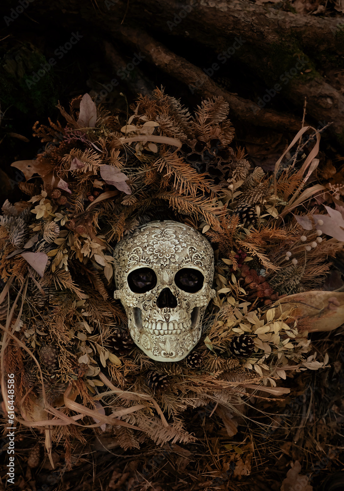 Decorative skull and dry autumn leaves on dark natural background. symbol of Halloween, Samhain. magic esoteric ritual. Mysticism, wiccan divination, occultism, Witchcraft concept. template for design