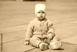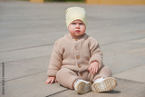 The toddler is sitting on the asphalt in a warm knitted suit