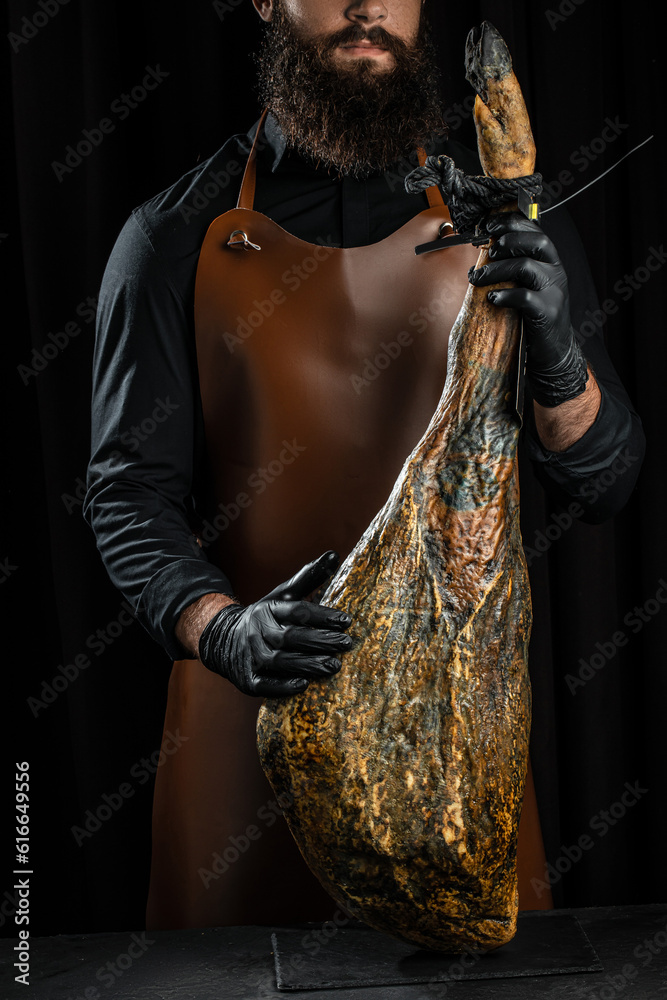 cutting specialist cortador holds Iberian ham pata negra, Dry Spanish ham, Jamon Serrano, Bellota, Italian Prosciutto Crudo or Parma ham