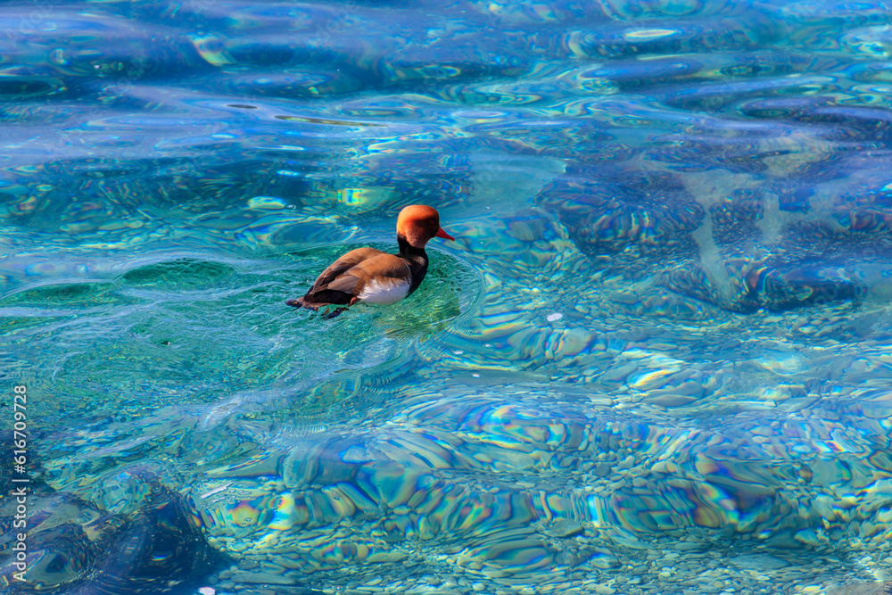 Red-crested pochard (Netta rufina) swimming in a lake