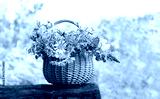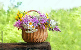 fresh useful herbs and flowers in wicker basket on tree stump, green natural background. Healthy medical plants harvest for preparation infusion, tea. organic vitamins of wild nature. copy space