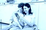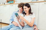 Beautiful young couple in love at home sitting at room touching at mobile phone Happy family young wife and husband couple using smart phone watching videos social media in kitchen together